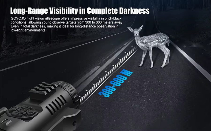 Designed for superior performance in complete darkness or low light, this digital night vision scope offers an impressive range of 300-600 meters in total darkness and unlimited range in dim light. Equipped with a Type-C interface and video output, it is perfectly suited for nighttime use.