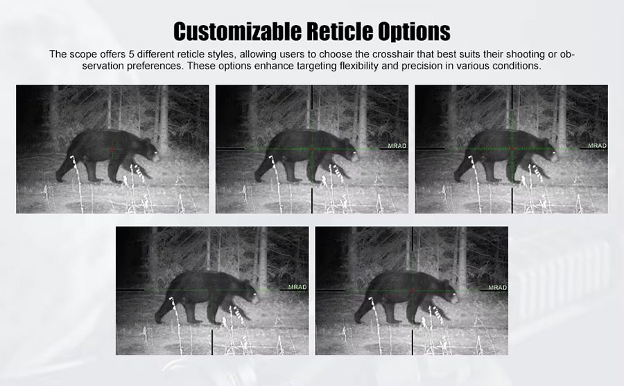 The integrated infrared illuminator enhances visibility in pitch-black conditions. Users can manually activate night mode and adjust the infrared intensity based on distance. As a hunting night vision scope, it ensures precise target detection even in the darkest environments.